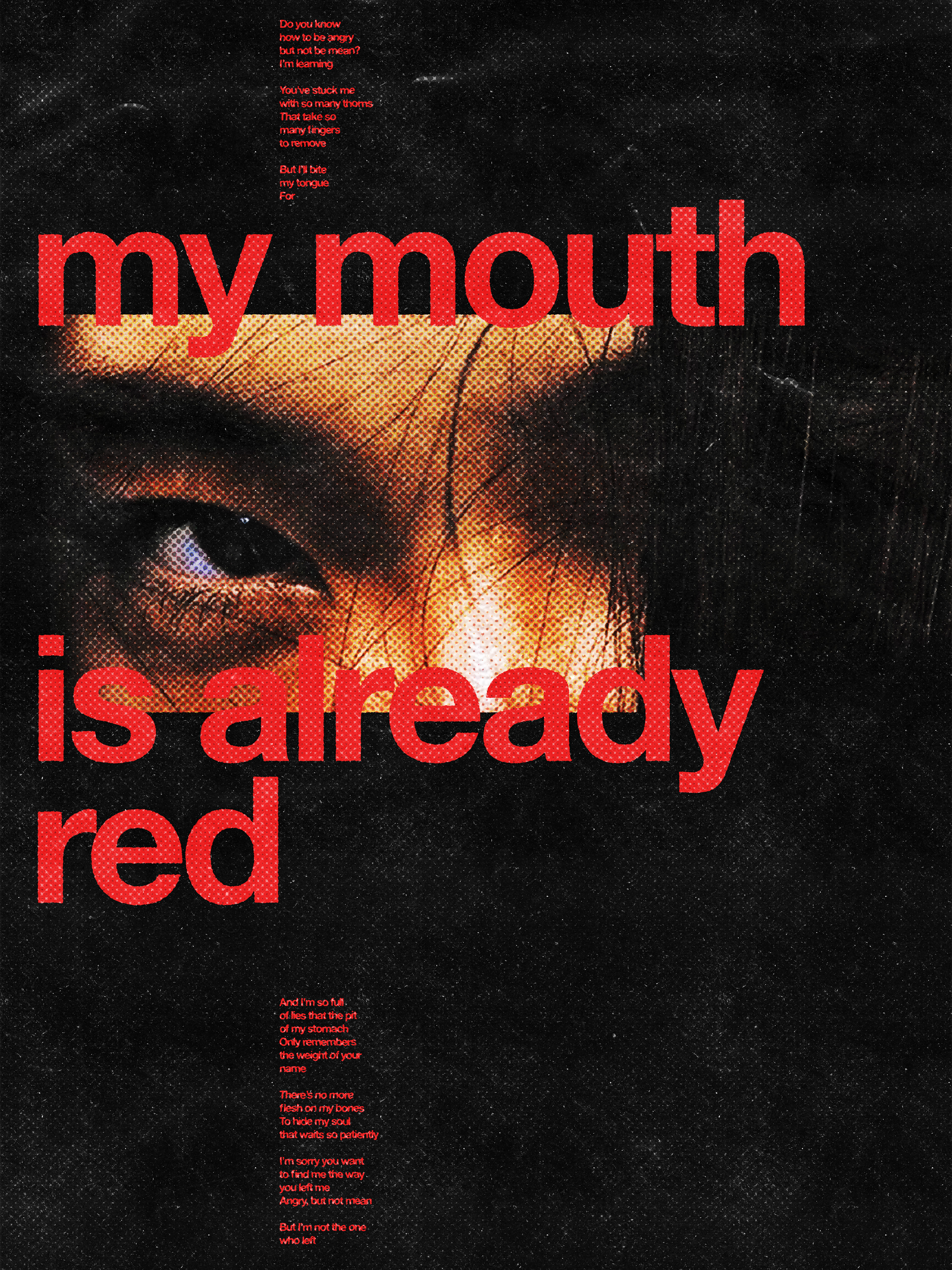 This collection showcases a series of personal design posters exploring visual tension, space, and emotion through bold typography and layered texture. These pieces reflect my interest in storytelling through form, balancing clarity with experimentation to create work that invites interpretation. Each design demonstrates my ability to blend conceptual thinking with precise technical execution across print and digital media.